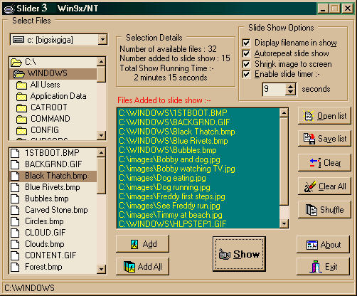 SLIDER allows you to select image files from your hard drive directories and display them fullscreen. The program includes options for setting the time for displaying each image or for fitting the image to the screen size. The slide show can run indefinately or until the user presses the ESC key. The user can also cycle through the images by pressing the RIGHT ARROW or LEFT ARROW key.